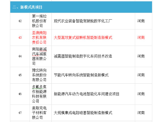 亞澳農機被國家工信部評為2017年智能制造綜合標準化與新模式應用項目名單