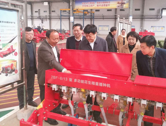 參觀過程中,劉樹華部長親切的向郭總咨詢公司的產(chǎn)品,郭總向劉樹華部長簡述了2BF-6/13 多功能花生精量播種機(jī)的功能構(gòu)造,在得知該款機(jī)型當(dāng)年投產(chǎn)當(dāng)年熱銷后,劉部長十分高興的對郭總說:“亞澳要進(jìn)一步開展科技研發(fā)工作,多培養(yǎng)、招聘科研人員,增強(qiáng)自身科研力量,成為農(nóng)機(jī)具行業(yè)的標(biāo)桿”,周天龍縣長對劉樹華部長說:“縣政府已批給亞澳30多畝土地,作為亞澳的科技研發(fā)中心”。